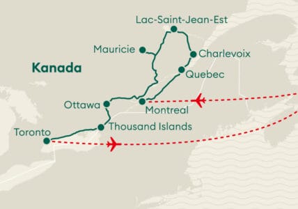 Hier schlägt das Herz unbeirrt im Takt von Mutter Natur! Gipfel, von Schnee bedeckt, beeindruckende Wasserfälle, dicht bewachsene Regenwälder und kilometerlange Strände – hier kommen Outdoor-Fans auf ihre Kosten. Voll im Trend liegen auch Kanadas moderne Grossstädte wie Vancouver, Montreal oder Toronto. Die Kanadier sind bekannt für ihre offene und freundliche Art. Die Vorzeichen für eine unvergessliche Kanadareise stehen gut.