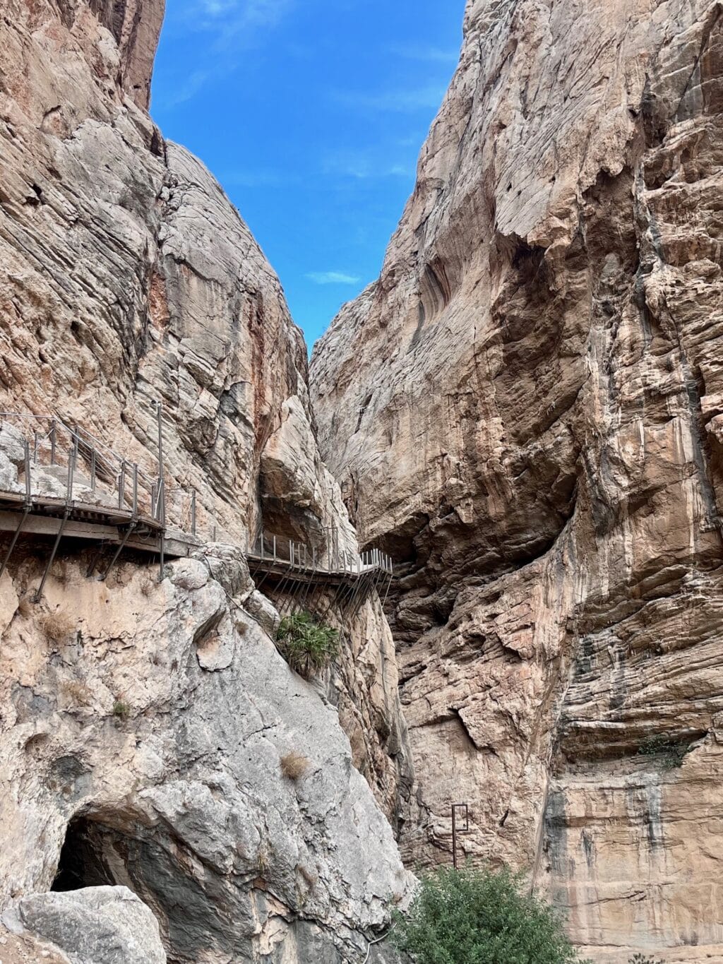 Endlich stand der Caminito del Rey auf dem Programm. Trotz der drohenden Regenwolken klarte es auf, als wir starteten. Der schwindelerregende, aber gut gesicherte Pfad führte uns durch die beeindruckende Schlucht und endete mit einer Hängebrücke, die im heftigen Wind wackelte, die Nerven nochmals testete und uns die Helme festhalten liess.